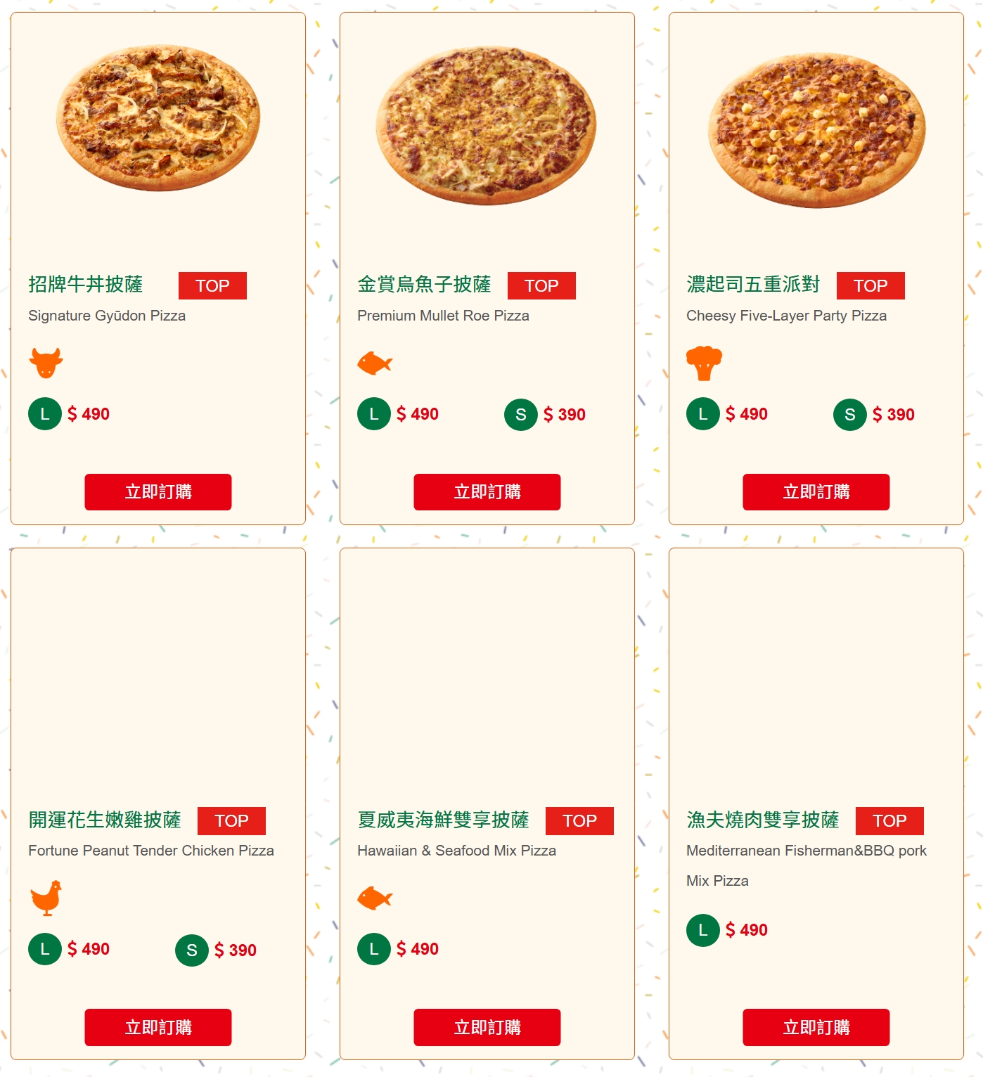 | 義式海陸豪華披薩 | 蝦仁、花枝、燻雞肉、培根、蘑菇、青豆、洋蔥 | 390元 | 199元 |