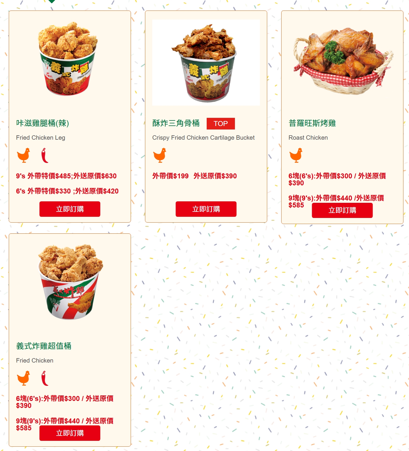 - 咔辣雞腿桶(炸雞,辣)、普羅旺斯烤雞(淋義式醬料)、義式炸雞超值桶(口味有義式微辣、原味不辣-蒜味)