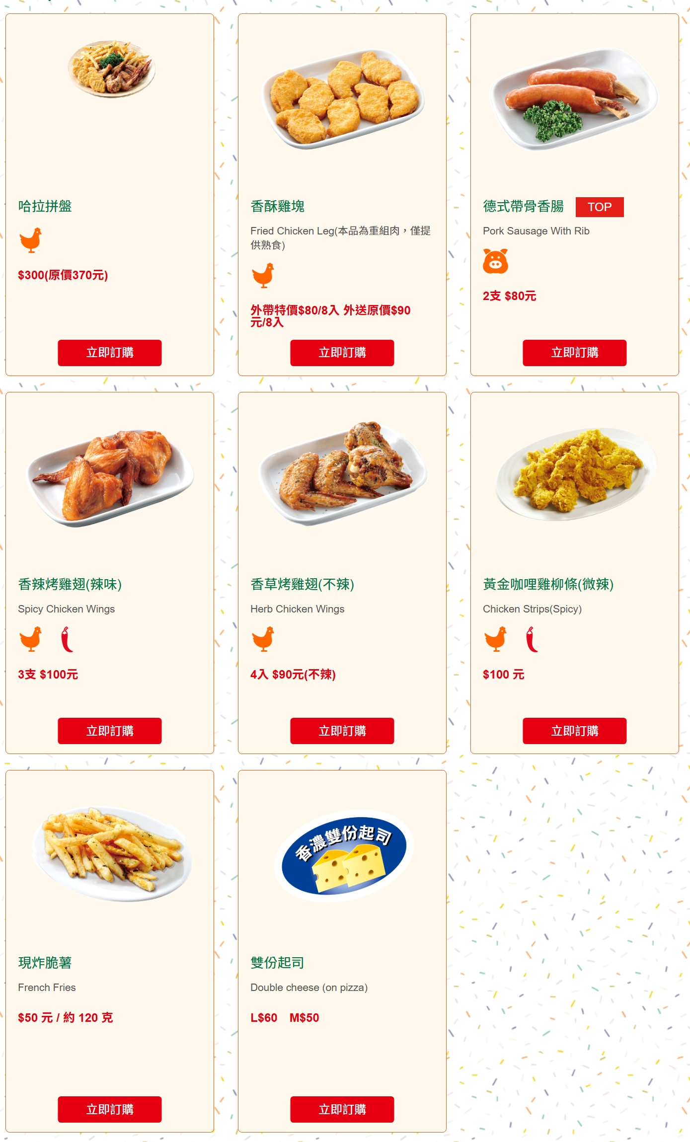 | 哈拉拼盤 | 香草烤雞翅*8+香酥雞塊*8+現炸脆薯*2 | 300元 | 370元 |