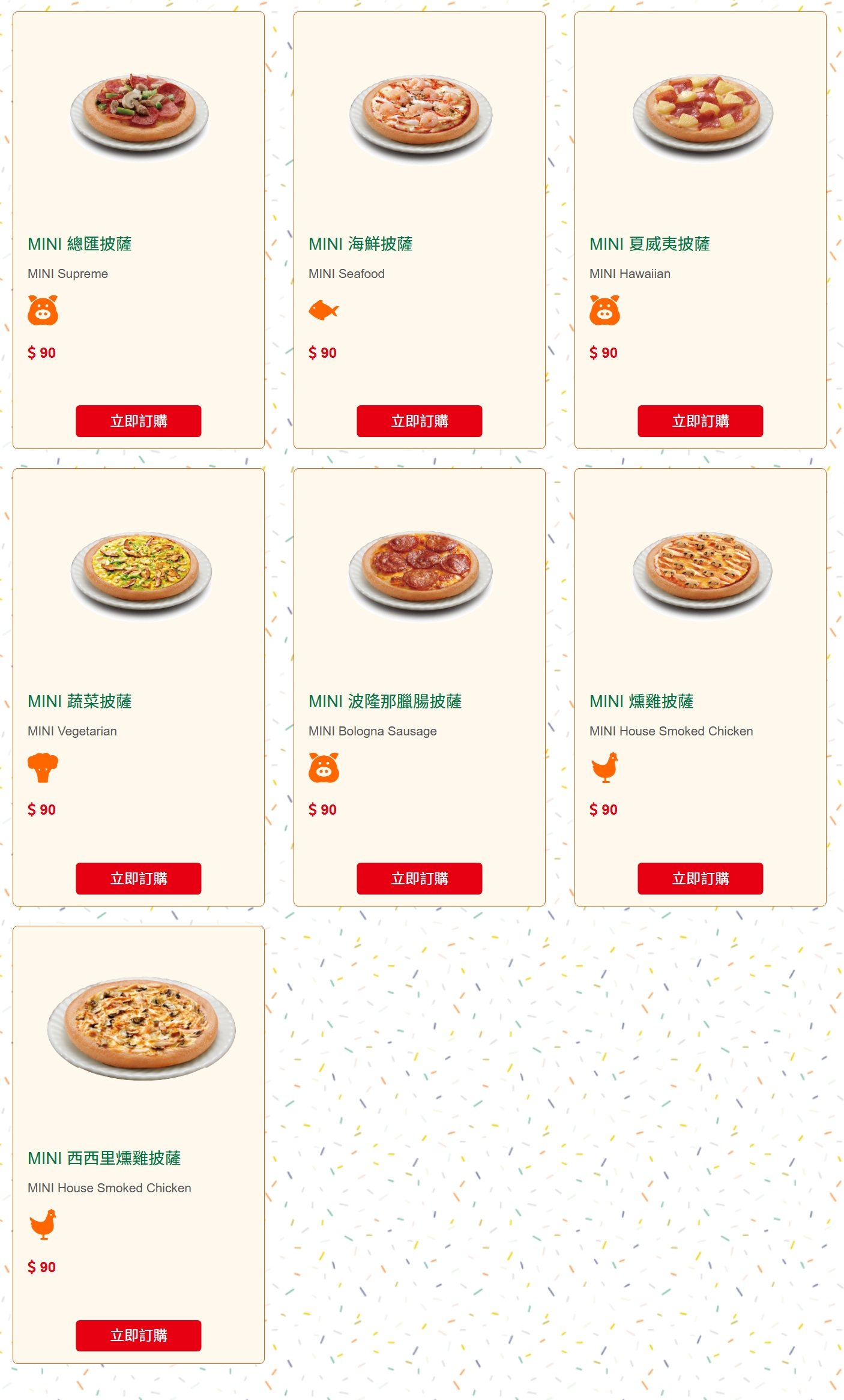 - MINI披薩口味:總匯、海鮮、夏威夷、蔬菜、臘腸、燻雞