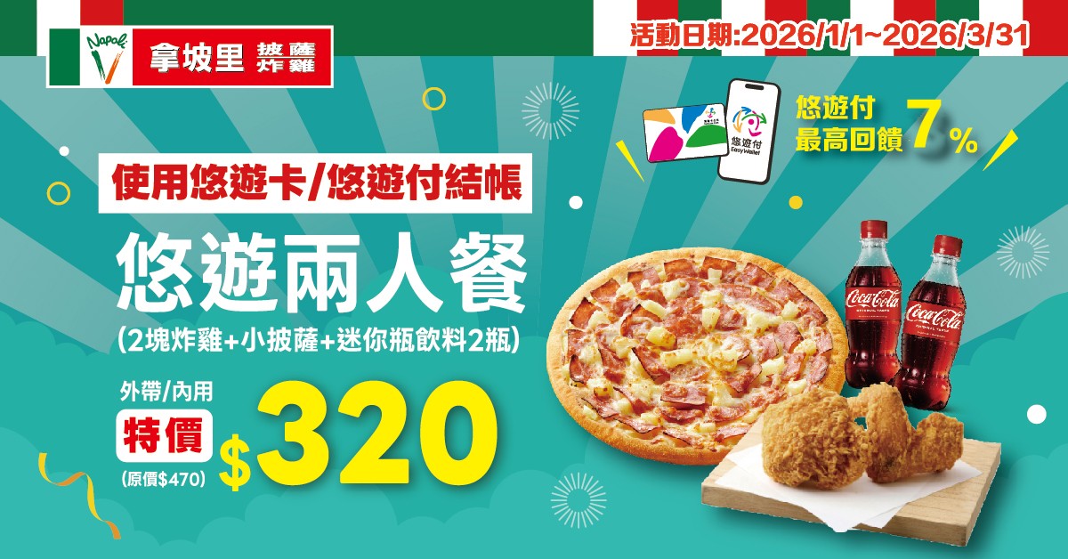 2026 年 3 月 31 日前,至拿坡里買悠遊兩人餐(小披薩+2塊炸雞+2瓶迷你瓶飲料350ml),使用悠遊卡、悠遊聯名卡或悠遊付結帳,享優惠 320 元(原價470元)。