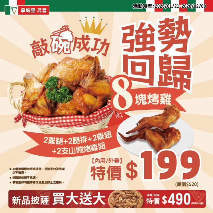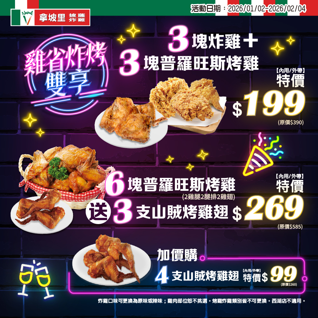 2026 年 1 月 2 日至 2 月 4 日到拿坡里披薩店內用或外帶 3 塊炸雞和 3 塊普羅旺斯烤雞,優惠價 199 元。