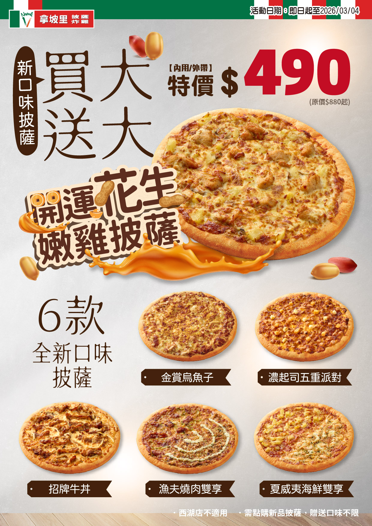 2026 年 1 月 16 日至 3 月 4 日購買新品,可享買大送大優惠,包括新推出的開運花生嫩雞披薩,只要 490 元 !