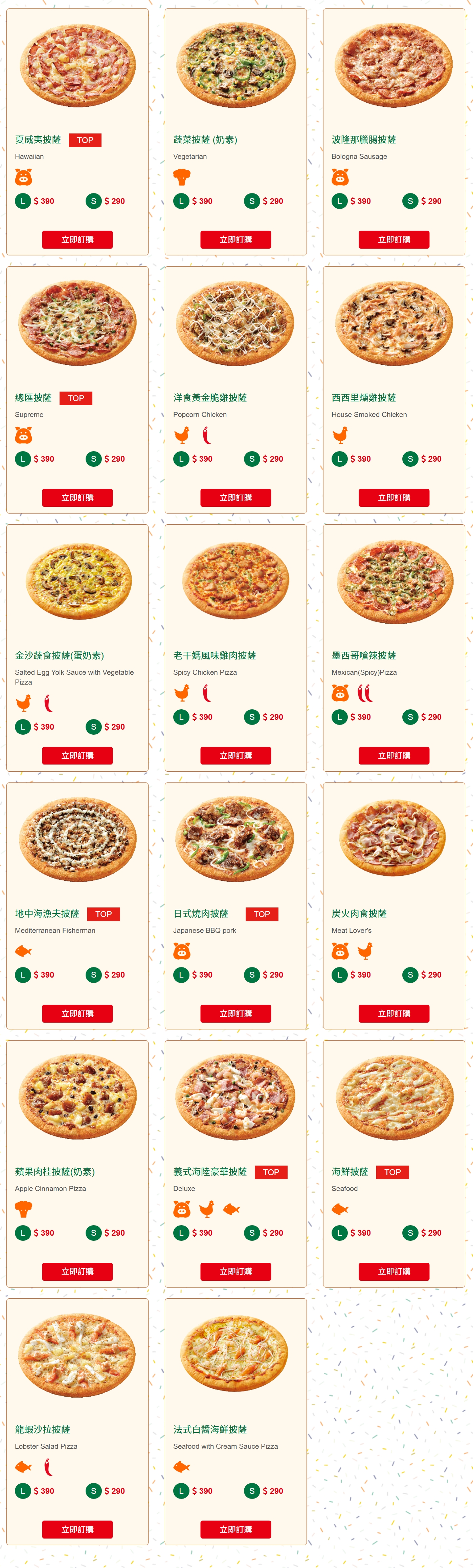 | 總匯披薩 | 豬肉餡、火腿、洋蔥、青椒、蘑菇、青豆、義式臘腸 | 390元 | 199元 |