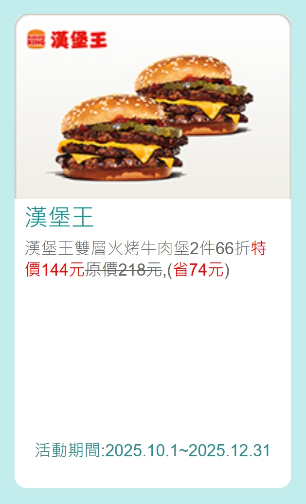 2025 年 12 月 31 日前,到中國信託銀行 ATM 提領、存款或轉帳,即可領取酷碰優惠券。憑券至漢堡王買「雙層火烤牛肉堡」 2 個可享 66 折優惠,特價 144 元,可省 74 元;買「華鱈魚堡滿足餐」可享優惠價 129 元,現省 87 元。