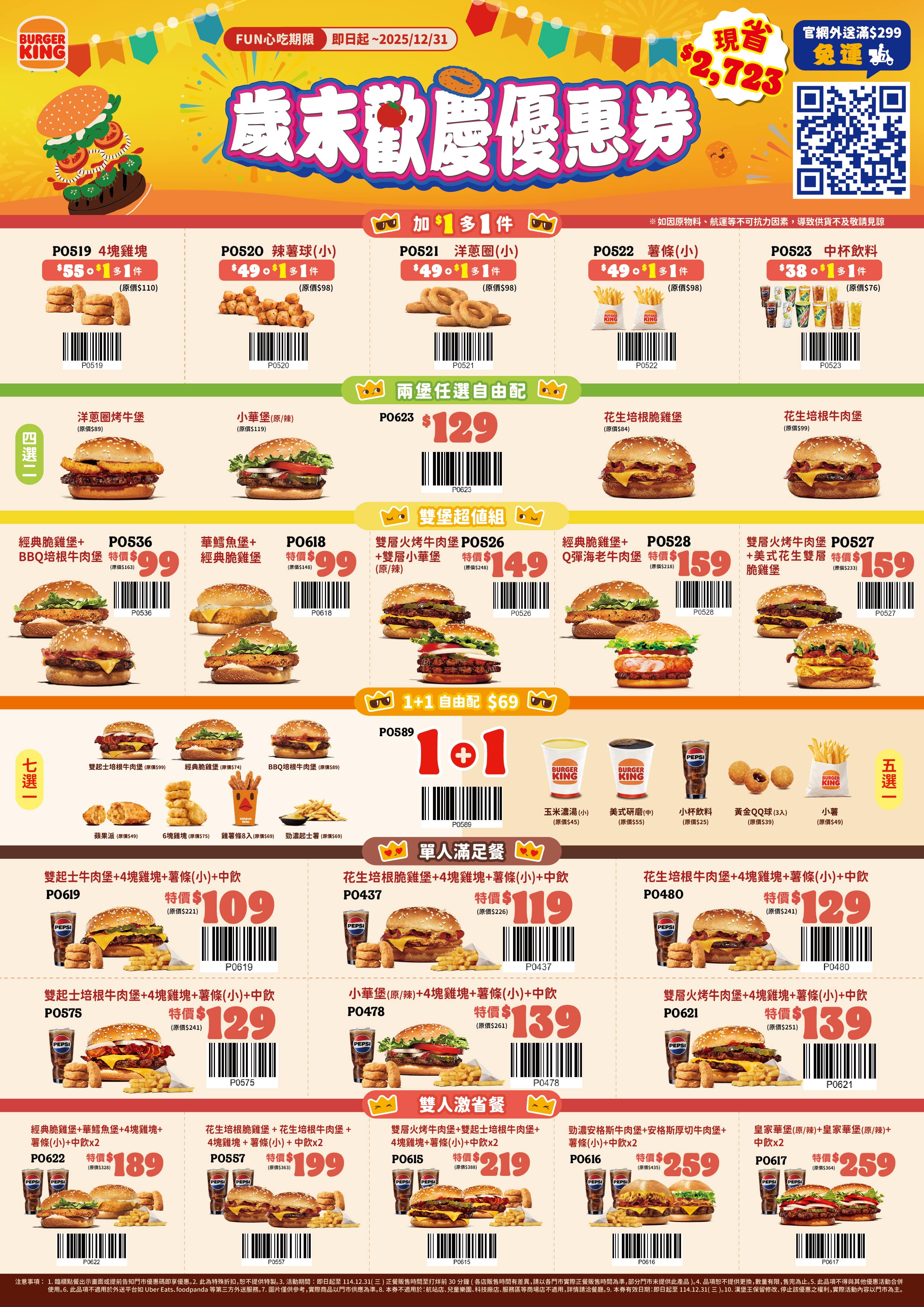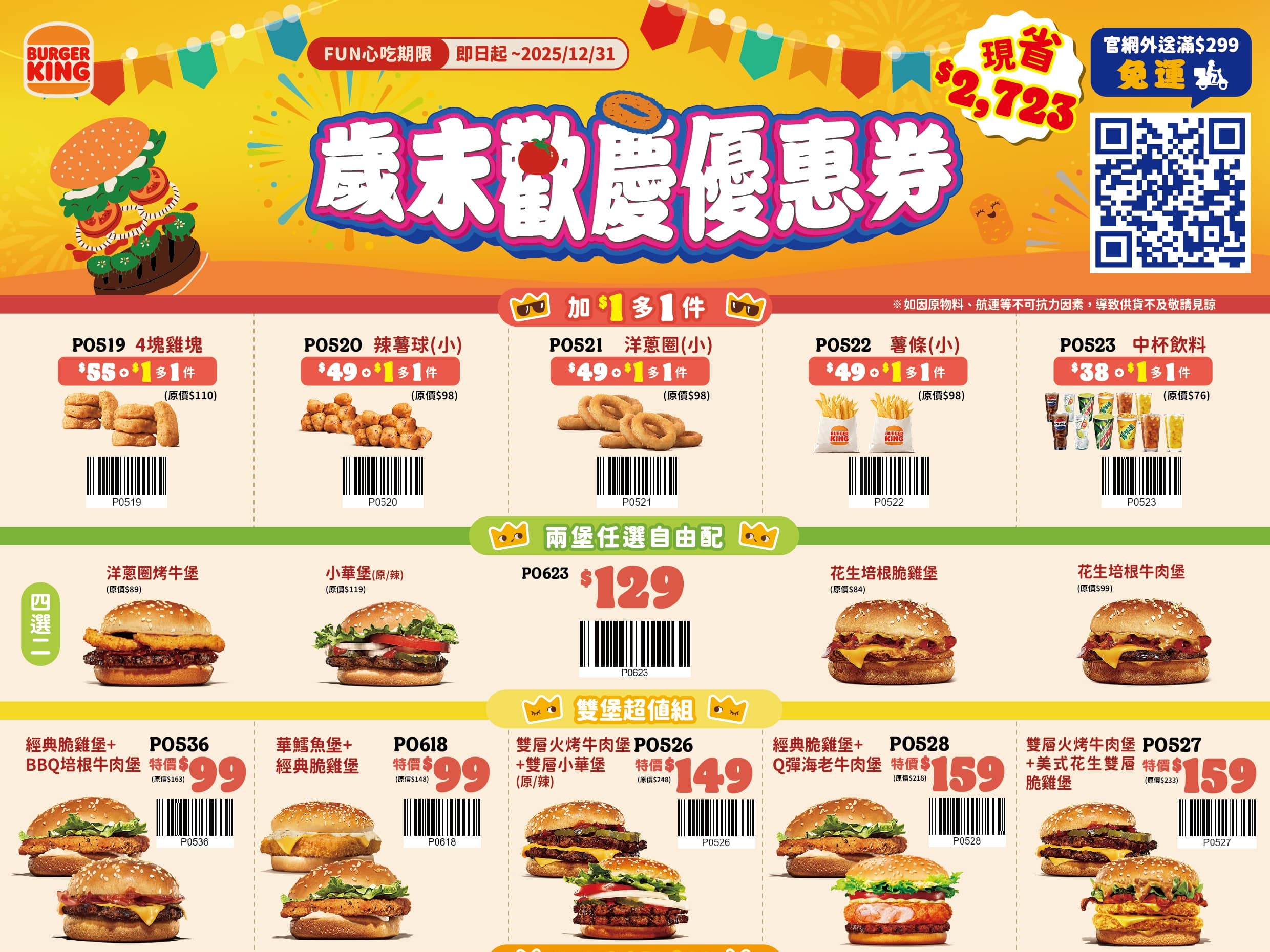 漢堡王於 10/1~12/31 推出全新優惠券,在官網點購4塊雞塊、小份薯條、小洋蔥圈、中杯飲料,可享加 1 元多 1 件優惠。