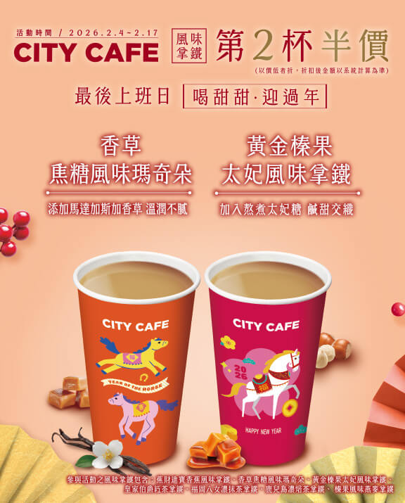 | CITY CAFE風味拿鐵 | 第2杯半價 | 2/4~2/17 |