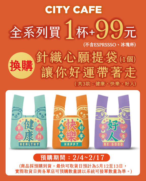 | CITY CAFE全系列 | 加購提袋99元 | 2/7~2/17 |