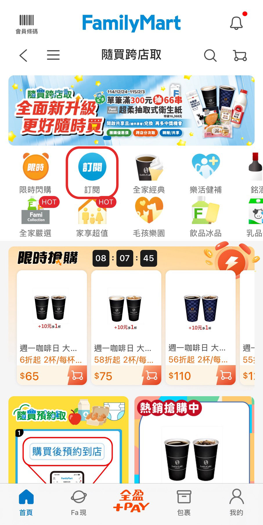 - 全家隨買跨店取限時活動、訂閱制咖啡/飲品7折起優惠:寄杯無期限優惠|訂閱制優惠