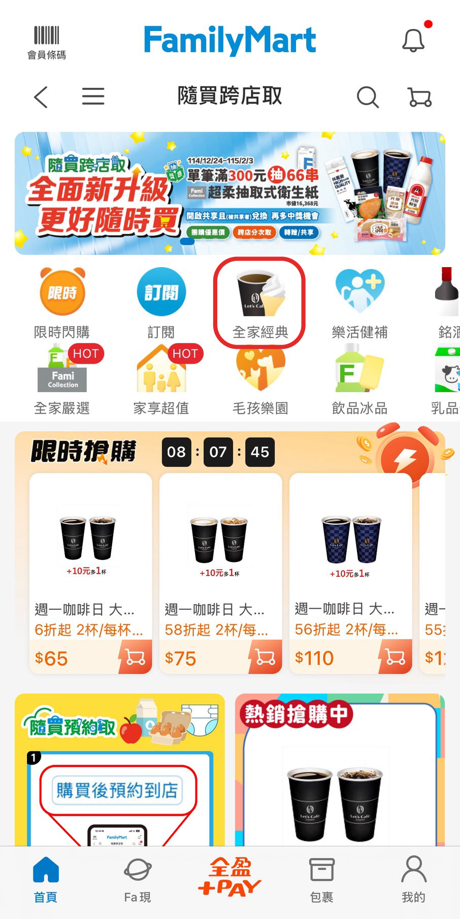除了可以在選單「全家經典」找到寄杯無期限的優惠,也可以在「限時閃購」找到快閃優惠,部分有兌換期限。