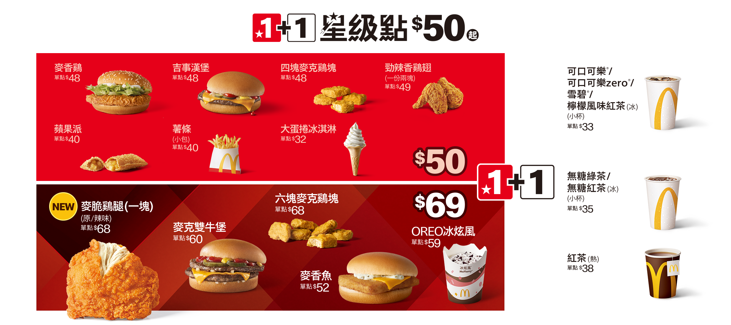 新品菜單|1+1=50元|1+1=69元|超值全餐及主餐|極選系列漢堡、沙拉|麥當勞分享盒
