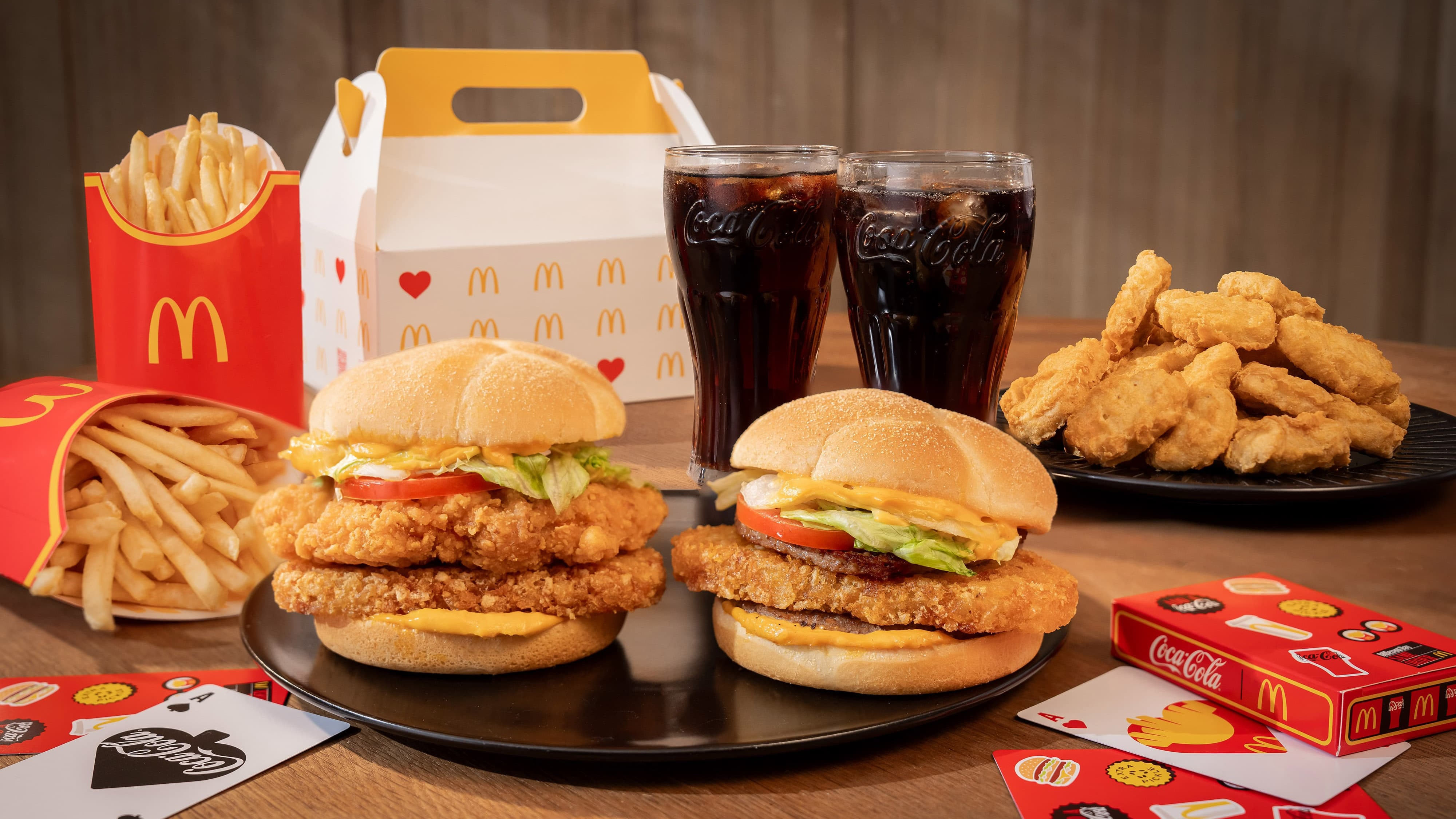 人氣漢堡「起司脆薯雙牛堡」、「起司三層牛肉堡」自 10/8 起回歸開賣,新「起司脆薯辣鷄堡」列入菜單,同步登場 ! 11/4 前購買分享盒加點指定飲料買一送一,以歡樂送買分享餐送撲克牌。