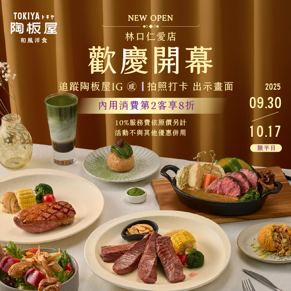 9/30~10/17 平日到林口仁愛店消費並追蹤ig,內用第 2 客享 8 折優惠。