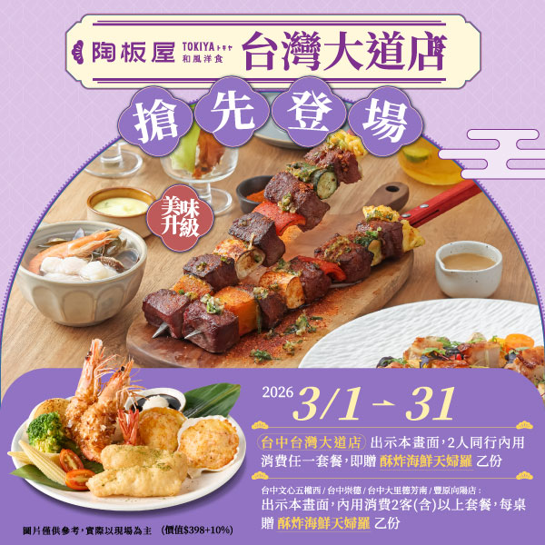 3 月 1 日至 3 月 31 日陶板屋台中分店祭出優惠,歡慶台灣大道店開幕 ! 民眾至文心五權西、崇德、大里德芳南、豐原向陽店點 2 份(含)以上套餐並出示活動畫面,送「酥炸海鮮天婦羅」一份。