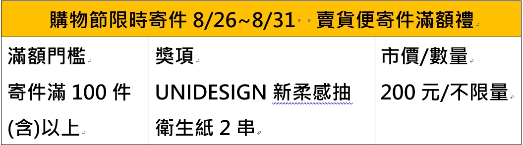 另外賣貨便在 8 月持續感恩,推出「寄件成長禮大回饋」優惠活動,凡賣家 8 月常溫店取總寄件數超過 7 月常溫店取總寄件 100 件(含)以上,增加件數可於 9 月回饋免運(每人回饋上限 50 件)。