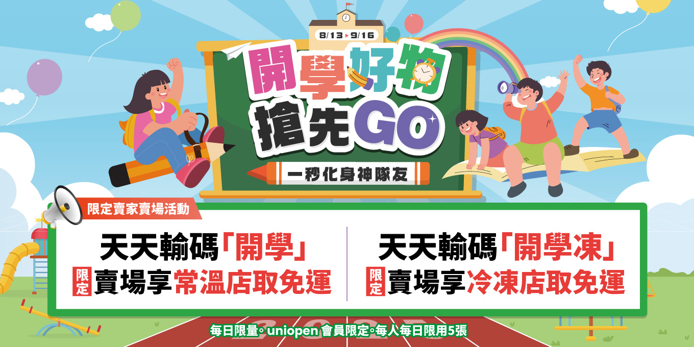 現在到賣貨便輸入優惠碼【開學】,購買活動指定賣場商品,享常溫店取免運優惠,不限消費金額;輸入優惠碼【開學凍】享冷凍店取免運 ! 免運券於每日 0 點發放,總共發送 10 萬份,活動期間每人每天限使用 5 張。