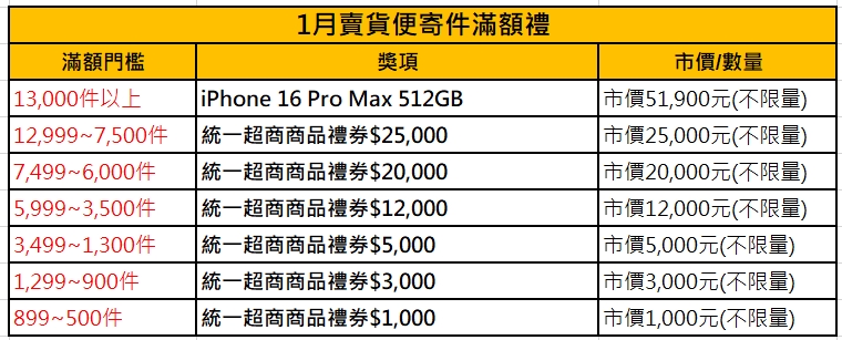 賣貨便推出賣家專屬優惠,於期間寄件滿額可獲得以下好禮(以簡訊通知兌換序號)。