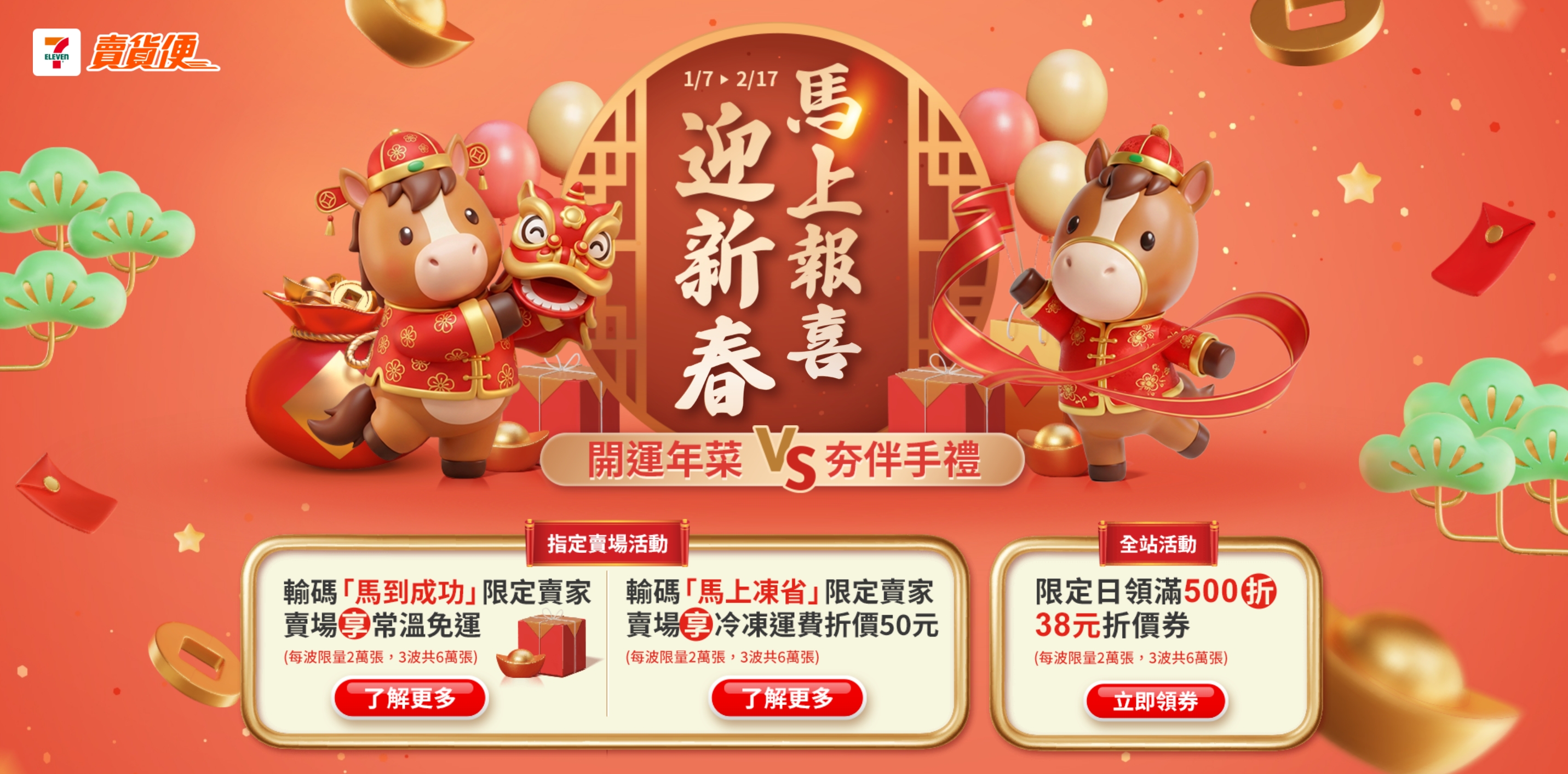 現在到賣貨便輸入優惠碼【馬到成功】,購買活動指定賣場商品,享常溫店取免運優惠,不限消費金額;輸入優惠碼【馬上凍省】享冷凍店取運費折 50 元 ! 活動分 3 波發放,運費折價及免運券於 1/7(三)、1/21(三)、2/4(三) 發放,各發送 2 萬份,活動期間每人每天限使用 5 張。另外還有全站滿額折價券,同樣分三波發放。