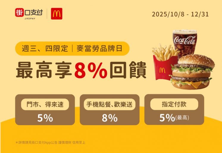 即日起至 2025/12/31 每週三、四使用街口支付付款,滿 200 元可享 5% 街口幣回饋,適用門市、自助點餐機、得來速點餐;手機點餐、歡樂送2.0 享 8%回饋,每次最多回饋 20 街口幣。👉優惠詳情