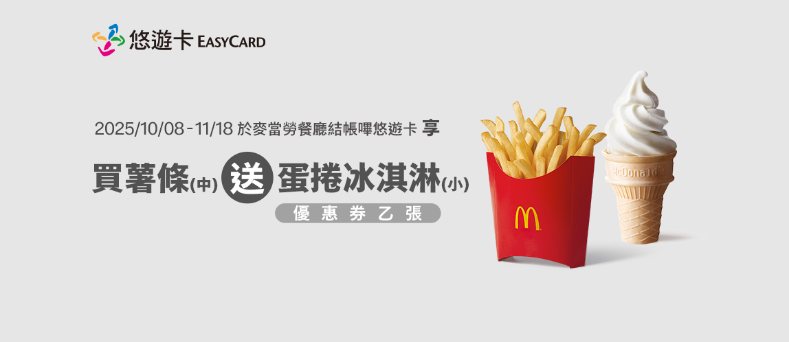 10/8~11/18 在餐廳櫃台、得來速、自助點餐機點餐並使用悠遊卡支付,可免費獲得優惠券一張,買中份薯條送小杯蛋捲冰淇淋。