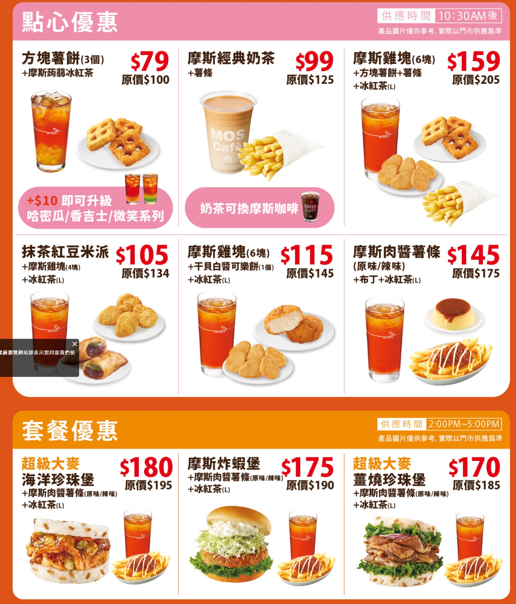 | T30 | 摩斯漢堡(原味/辣味) +雞塊地瓜組 +方塊薯餅*3 +冰紅茶(L) | 159元 |