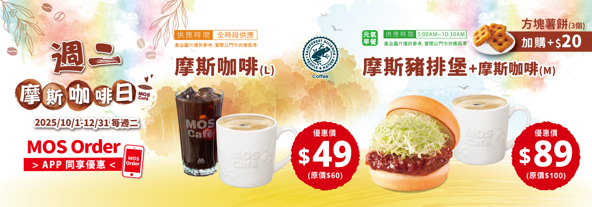 2025 年 10 月 1 日至 12 月 31 日每週二,買摩斯咖啡(L)享優惠價 49 元,適用全時段;早餐時段買「摩斯豬排堡+摩斯咖啡(M)」,優惠 89 元,另享 20 元優惠加購方塊薯餅 3 個;限摩斯會員APP購買。