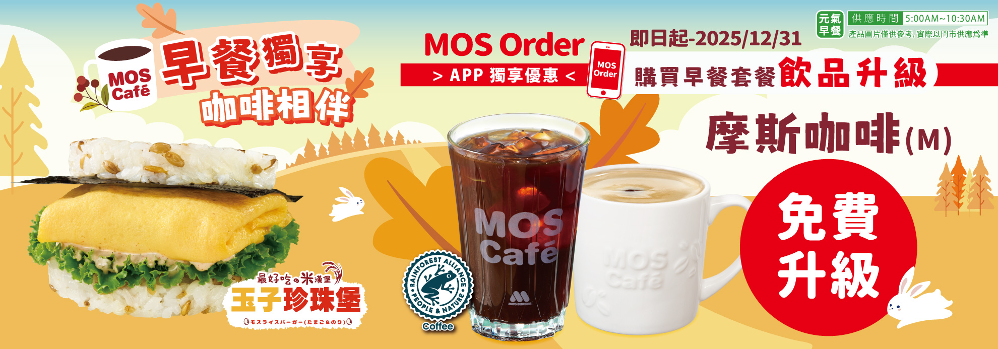 10/1~12/31,至摩斯漢堡買早餐套餐,可享飲品免費升級摩斯咖啡中杯優惠。
