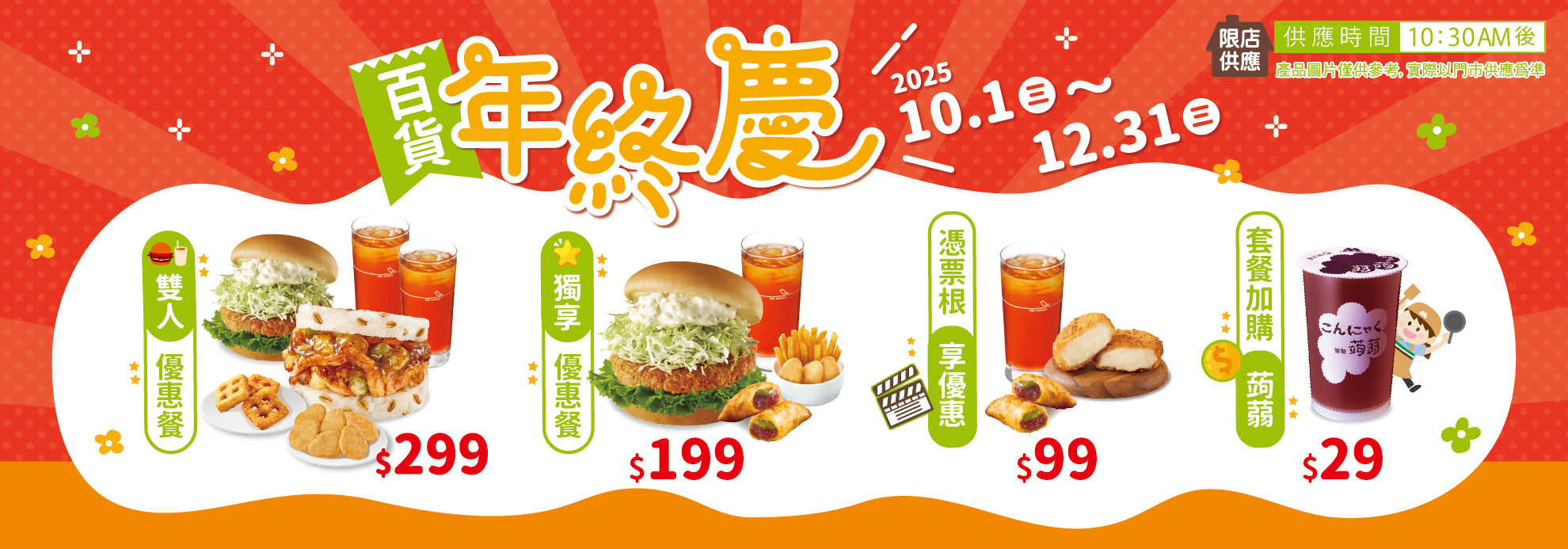 10 月 1 日至 12 月 31 日,至摩斯漢堡百貨門市買雙人優惠餐特價 299 元,指定快速優惠餐 199 元,憑票根享優惠 99 元,套餐加購蒟蒻 29 元。