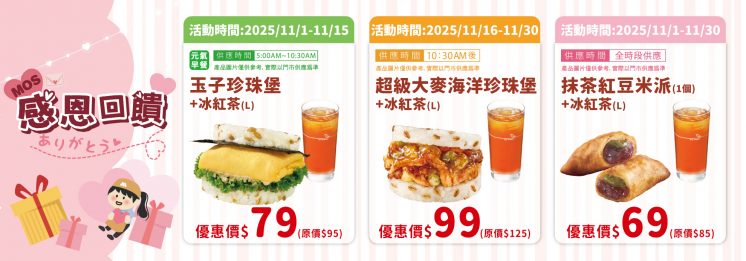 2025 年 11 月 1 日至 11 月 15 日至摩斯漢堡購買早餐套餐「玉子珍珠堡+冰紅茶(L)」優惠 79 元。