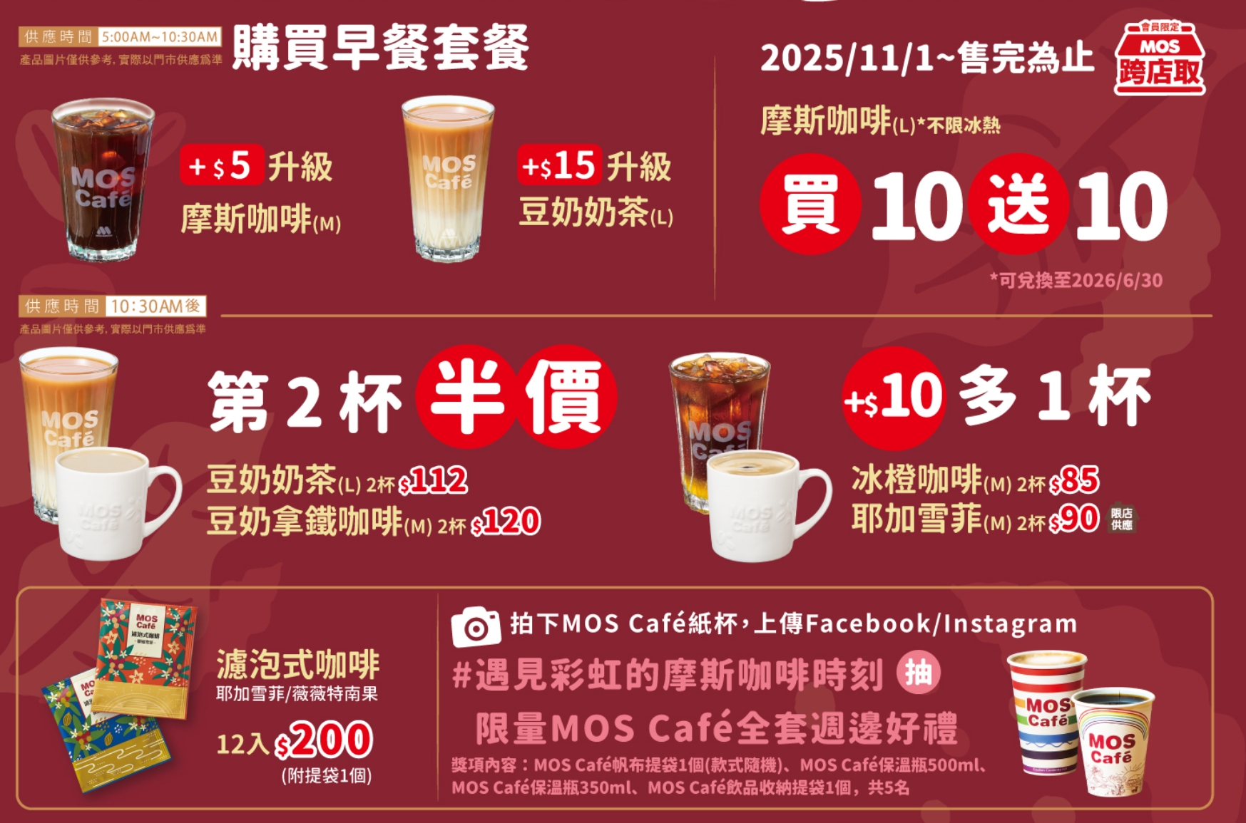 2025/11/1~11/30,購買早餐套餐可享 5 元會升級中杯摩斯咖啡,加 15 元升級大杯豆奶奶茶,豆奶奶茶(L)、豆奶拿鐵咖啡第 2 杯半價;11/1 至售完為止,摩斯咖啡大杯買十送十優惠。