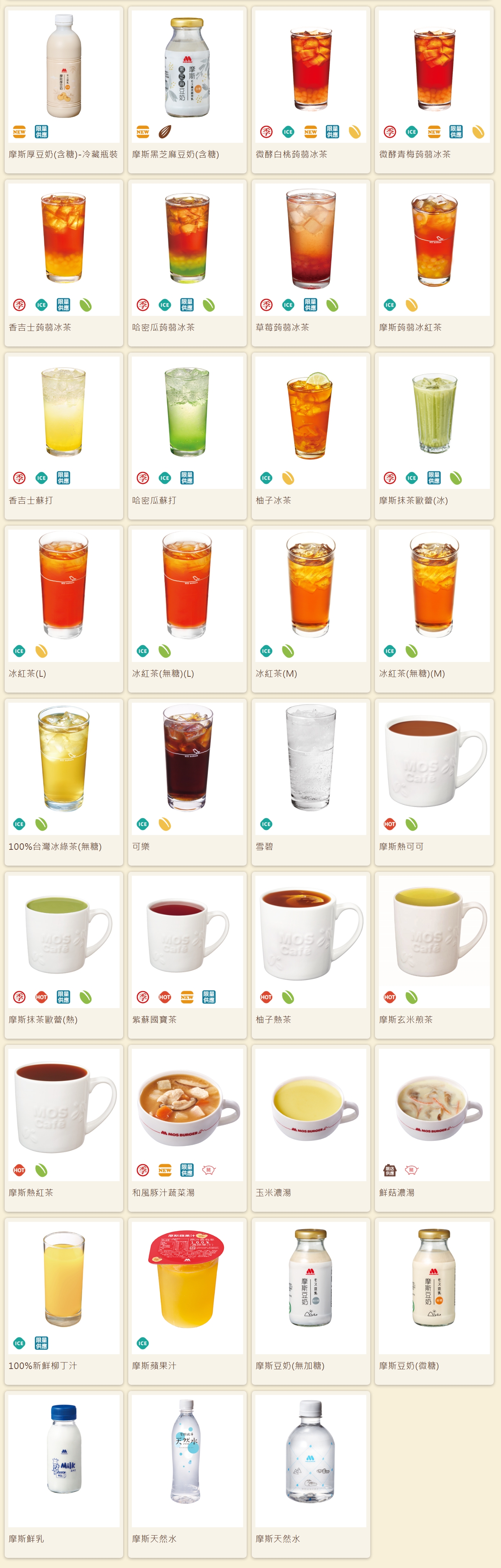 | T29 | 哈蜜瓜蘇打/蒟蒻冰茶 香吉士蘇打/蒟蒻冰茶 柳橙紅柚氣泡飲/蒟蒻冰茶 草莓蒟蒻冰茶/冰橙咖啡/摩斯蒟蒻冰紅茶 | 99元 |