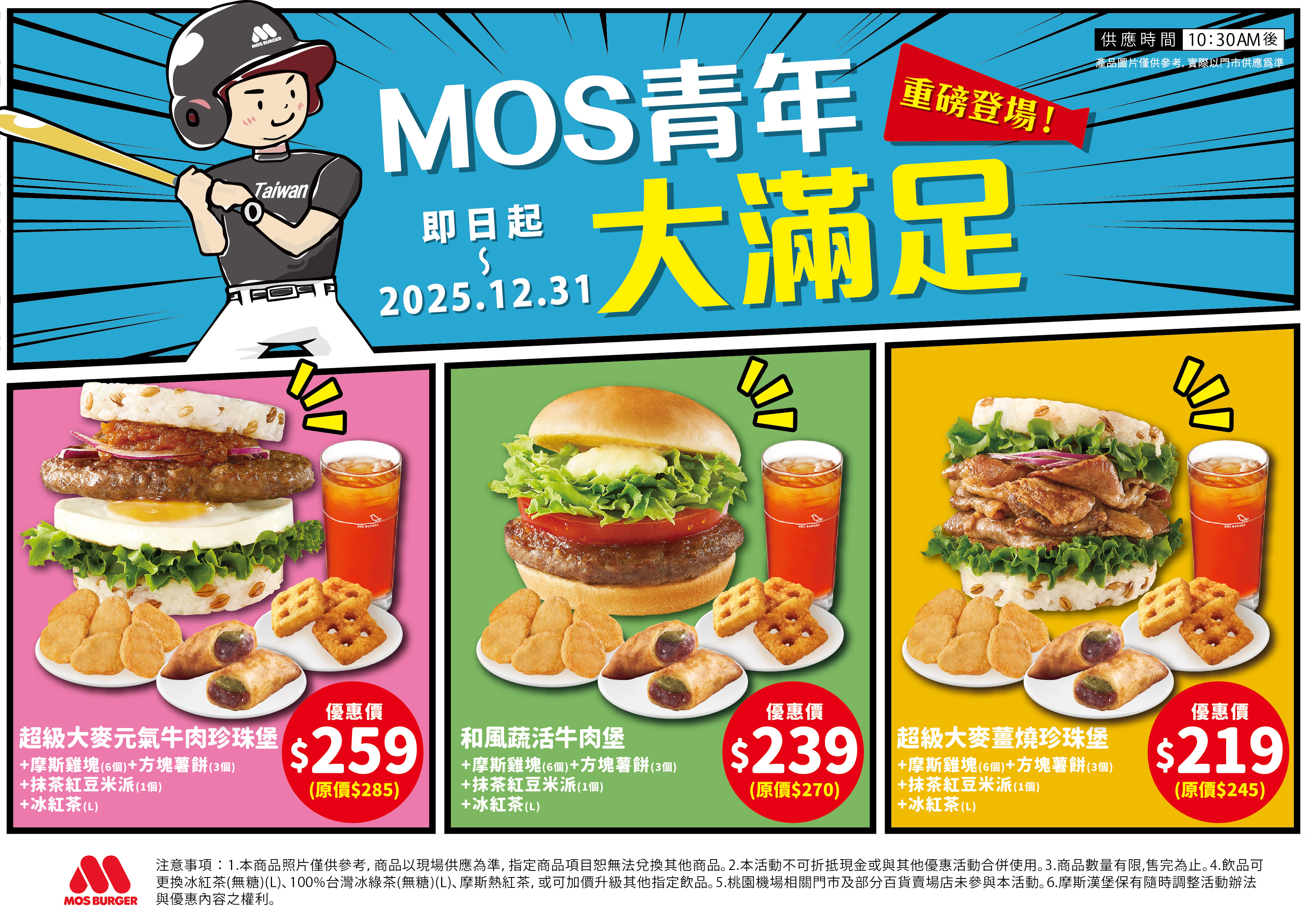 2025 年 11 月 1 日至 12 月 31 日,摩斯漢堡套餐組合「超級大麥元氣牛肉珍珠堡+摩斯雞塊*6+方塊薯餅*3+抹茶紅豆米派+冰紅茶大杯」優惠 259 元,「和風蔬活牛肉堡+摩斯雞塊*6+方塊薯餅*3+抹茶紅豆米派+大杯冰紅茶」優惠價 239 元,「超級大麥薑燒珍珠堡+摩斯雞塊*6+方塊薯餅*3+抹茶紅豆米派+大杯冰紅茶」優惠價 219 元。
