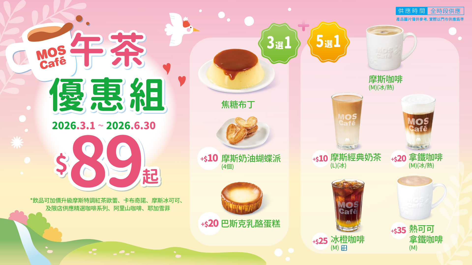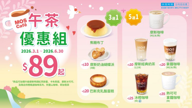 現在至 6/30,買焦糖布丁搭配摩斯咖啡 89 元起,另可加 10 至 35 元升級其他點心。