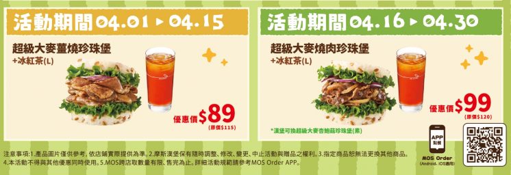 2026 年 1 月 1 日至 6 月 30 日,使用摩斯漢堡 MOS Order 座位點餐,加贈電子優惠券「美味券」,「超級大麥薑燒珍珠堡+摩斯雞塊*6+方塊薯餅*3+大杯冰紅茶」優惠價 180 元。單筆消費滿 180 元,再加碼超值回饋券,大杯摩斯冰紅茶優惠 20 元。
