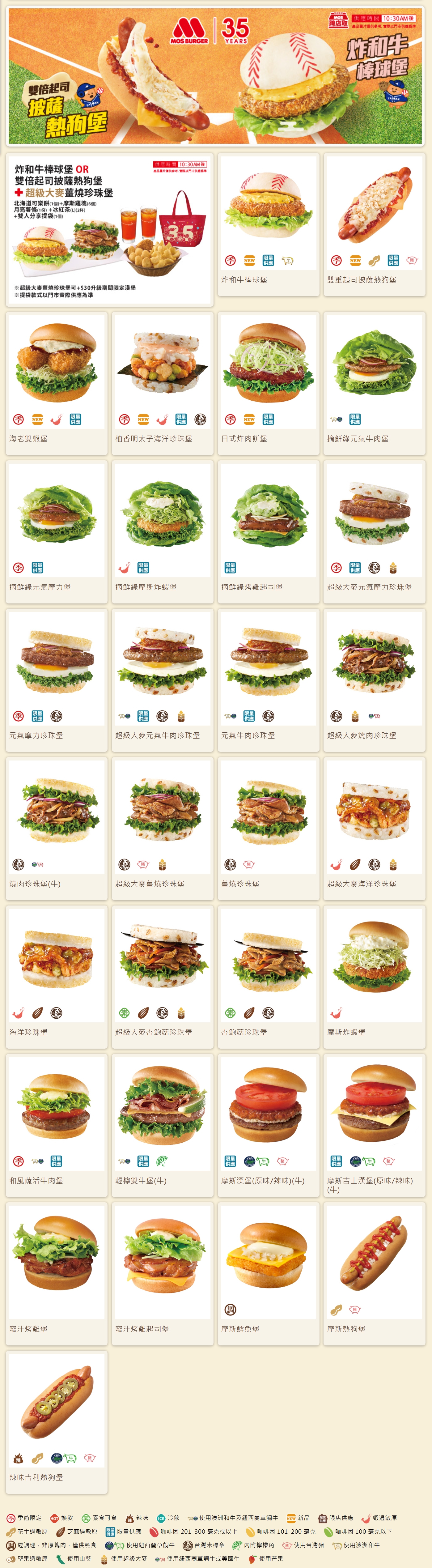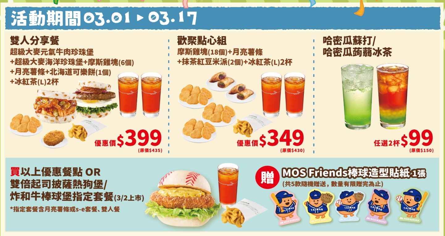 *點購以上餐點或【雙倍起司披薩熱狗堡/炸和牛棒球指定套餐】,送 MOS Freinds 造型貼紙 1 張 - 3/18~3/31 台灣橙康普蒟蒻冰茶、香吉士蘇打、冰橙咖啡任 2 杯特價 99 元