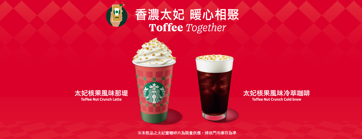 耶誕飲品「太妃核果風味那堤」、「太妃核果風味冷萃咖啡」於 11/5 起回歸,現在已上架菜單啦,快來品嚐 !