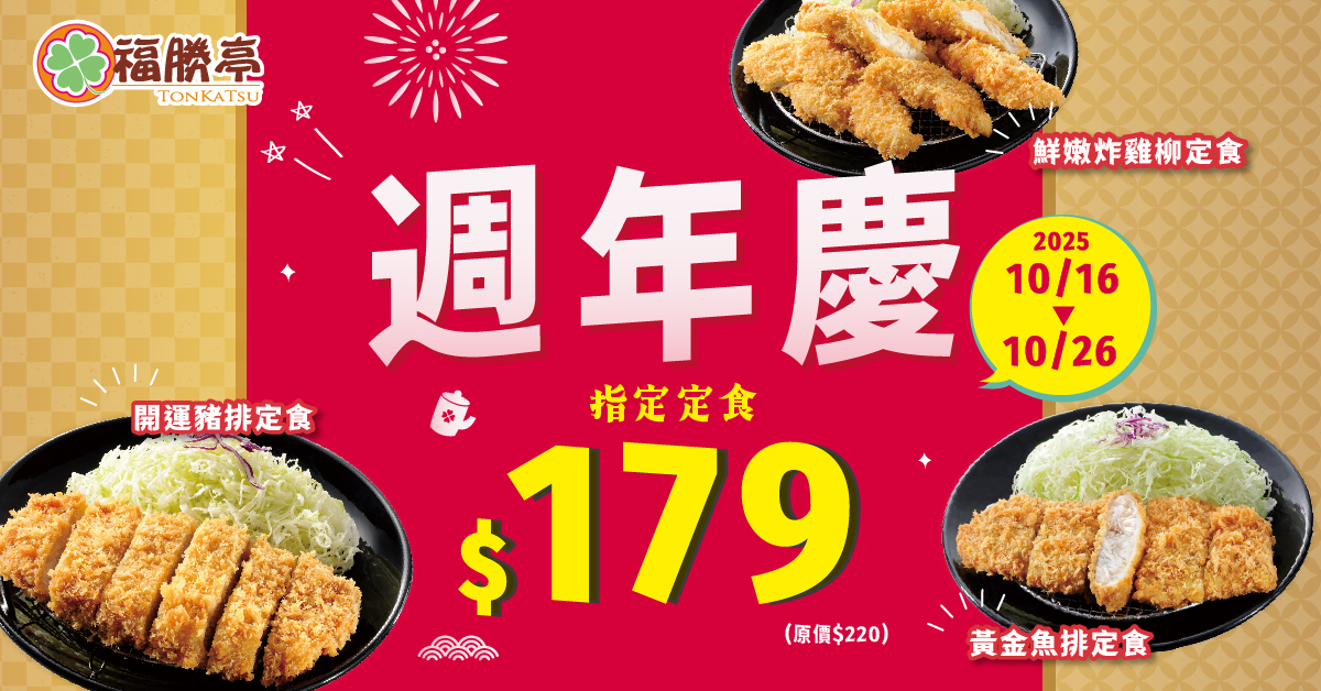 週年慶活動於 2025 年 10 月 16 日至 10 月 26 日登場,現在購買開運豬排定食、鮮嫩炸雞柳定食、黃金魚排定食,優惠 179 元。