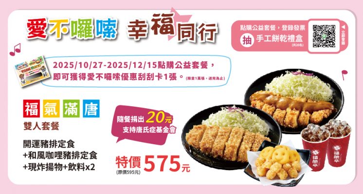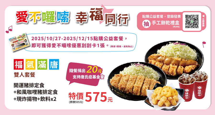 2025/10/27~12/15 到店購買「福氣滿唐」公益雙人套餐,含開運豬排定食、和風咖哩豬排定食、現炸揚物、飲料 2 杯,優惠價 575 元再送刮刮卡;掃描 QR Code 並上網登錄,再抽手工餅乾。