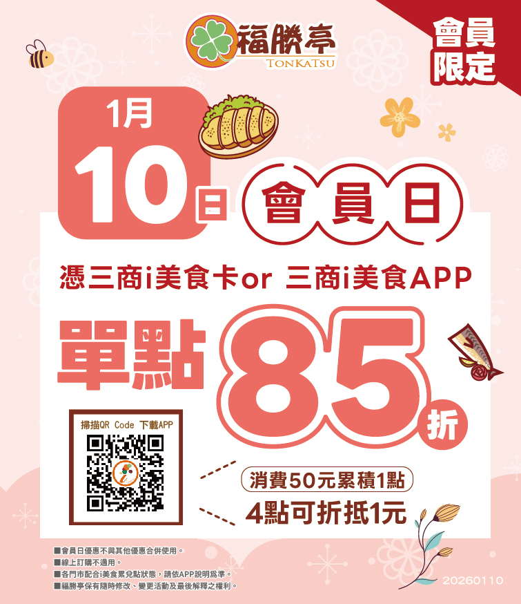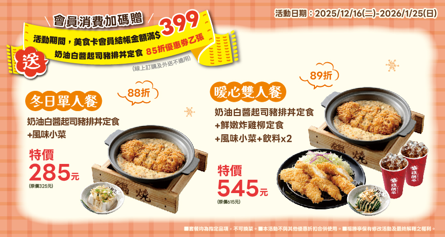 到福勝亭外帶或內用指定單人餐優惠價 285 元,雙人餐優惠價 545 元;活動期間使用美食卡會員結帳,消費滿 399 元可再獲得「奶油白醬起司豬排丼定食85折」優惠券一張。