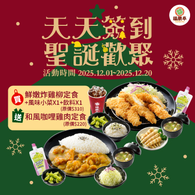 2025/12/1~12/20 至三商 i 美食卡 APP 簽到集章,滿 10 章可享優惠「鮮嫩炸雞柳定食+風味小菜+飲料+和風咖哩雞肉定食 530 元」,滿 5 個章可享買定食送涼拌小菜。
