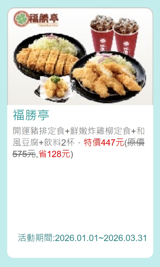 - 優惠內容:開運豬排定食+鮮嫩炸雞柳定食+和風豆腐+2杯飲料,特價 447 元。