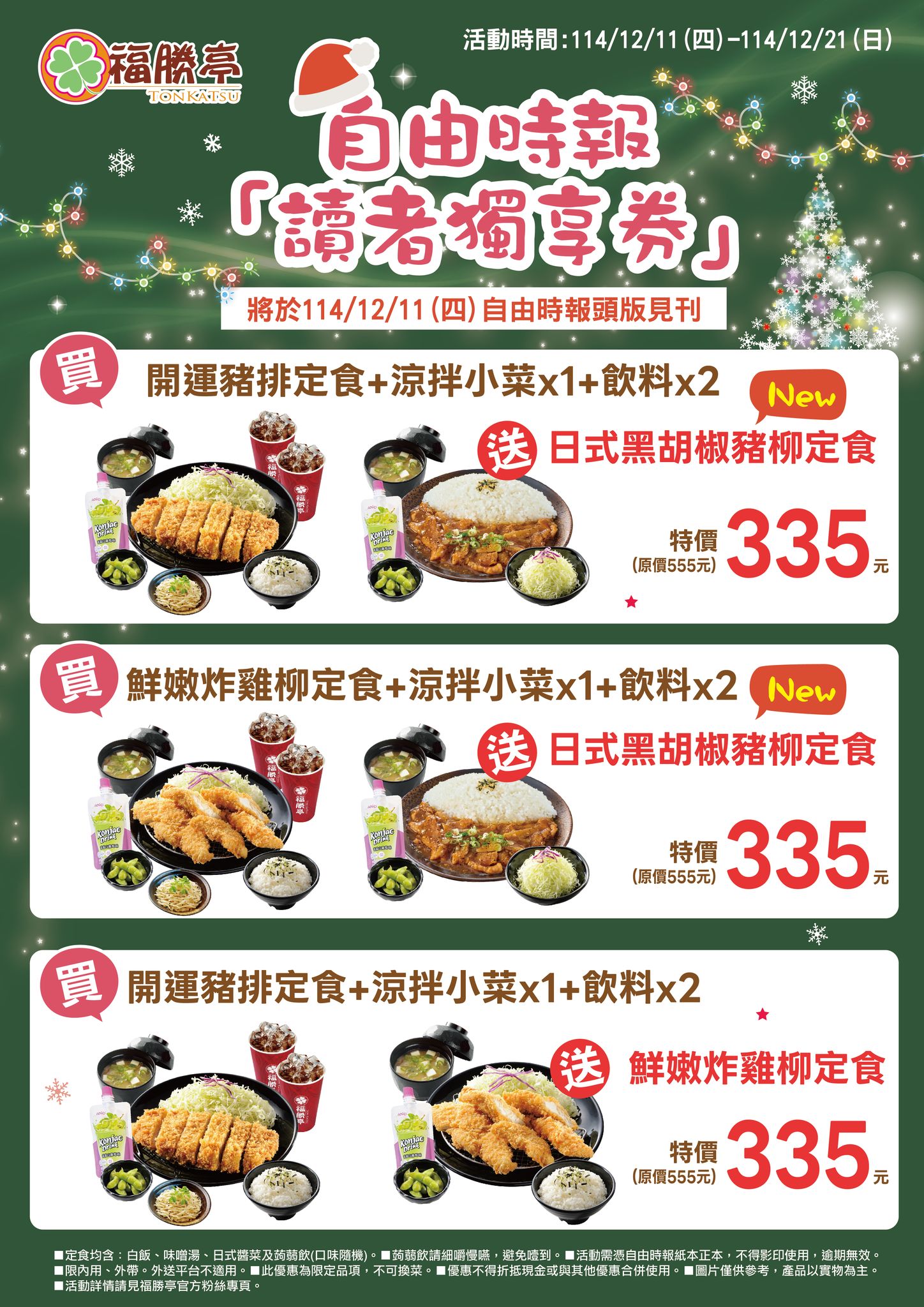 2025 年 12 月 11 日在自由時報頭版可取得讀者獨享券,到福勝亭買指定定食套餐享優惠;獨享券使用期限到 12/21。限紙本優惠券可享有折扣,不可使用手機翻拍或影印。