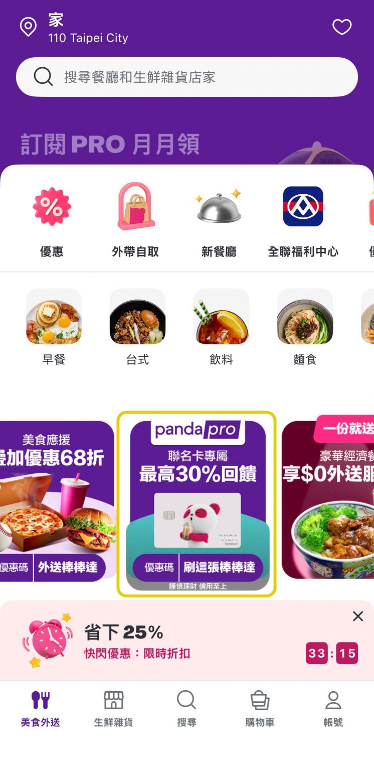 | foodpanda加碼 | 優惠碼4張(美食外送、外帶自取各 2 張) pandapro 用戶享 25% 胖達幣回饋 一般用戶享 15% 胖達幣回饋 | pandapro 250 一般用戶 170 |