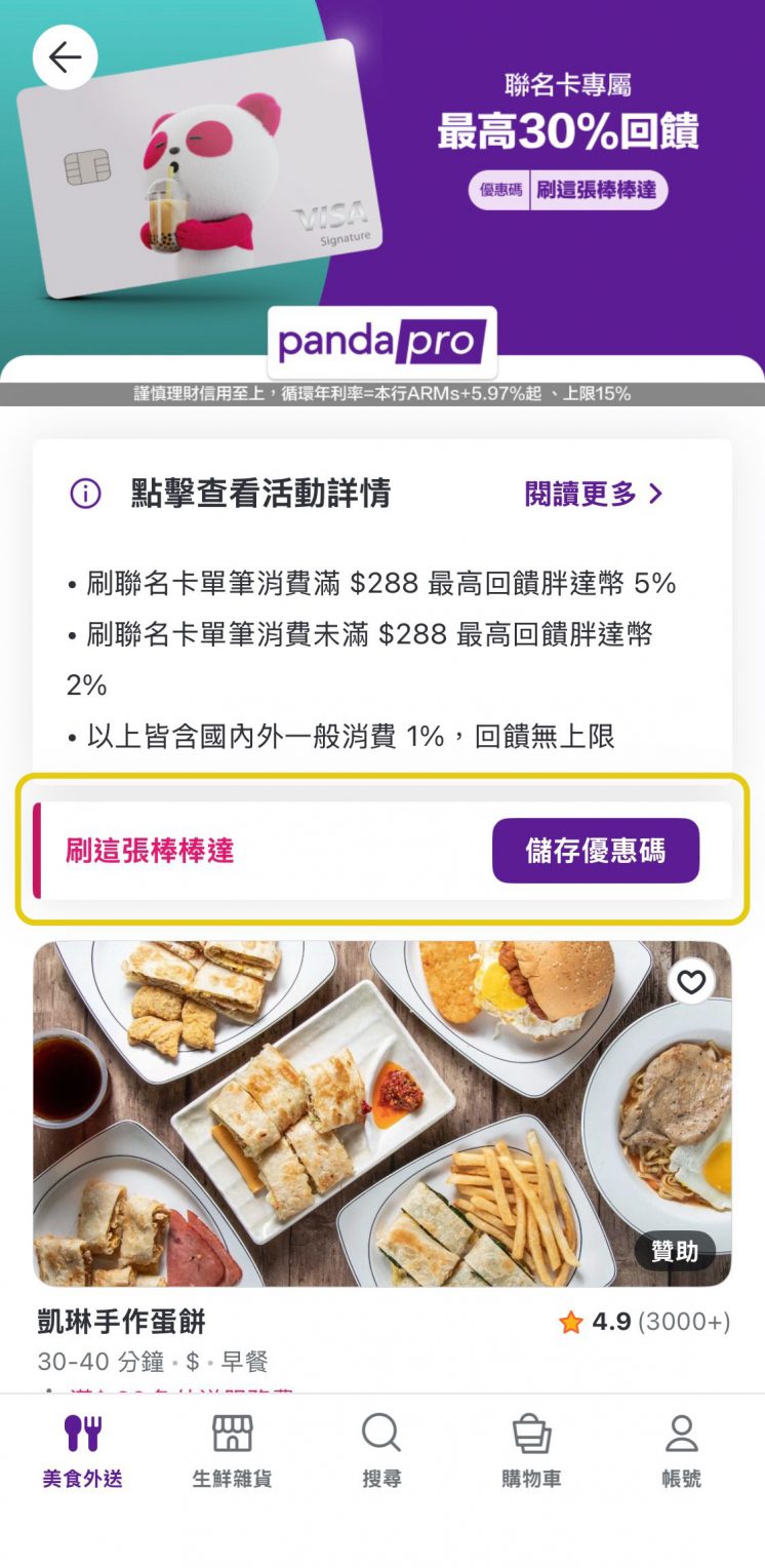 | 活動延長! 超 PRO 卡友日 | 【pandapro 一年制3折】 限使用 foodpanda 聯名卡訂閱 pandapro 結帳時輸入指定折價券 享 pandapro一年制 3 折 (原價 $1,079,優惠價 $324) 每季限量3,450名,兌完為止 【胖達幣最高 100% 回饋】 限 pandapro 用戶使用 foodpanda 聯名卡 於美食外送或外帶自取刷滿 $99 輸入指定優惠碼享 100% 胖達幣回饋 最高回饋胖達幣 150 元 每季限量6,000名,兌完為止 | 450 |