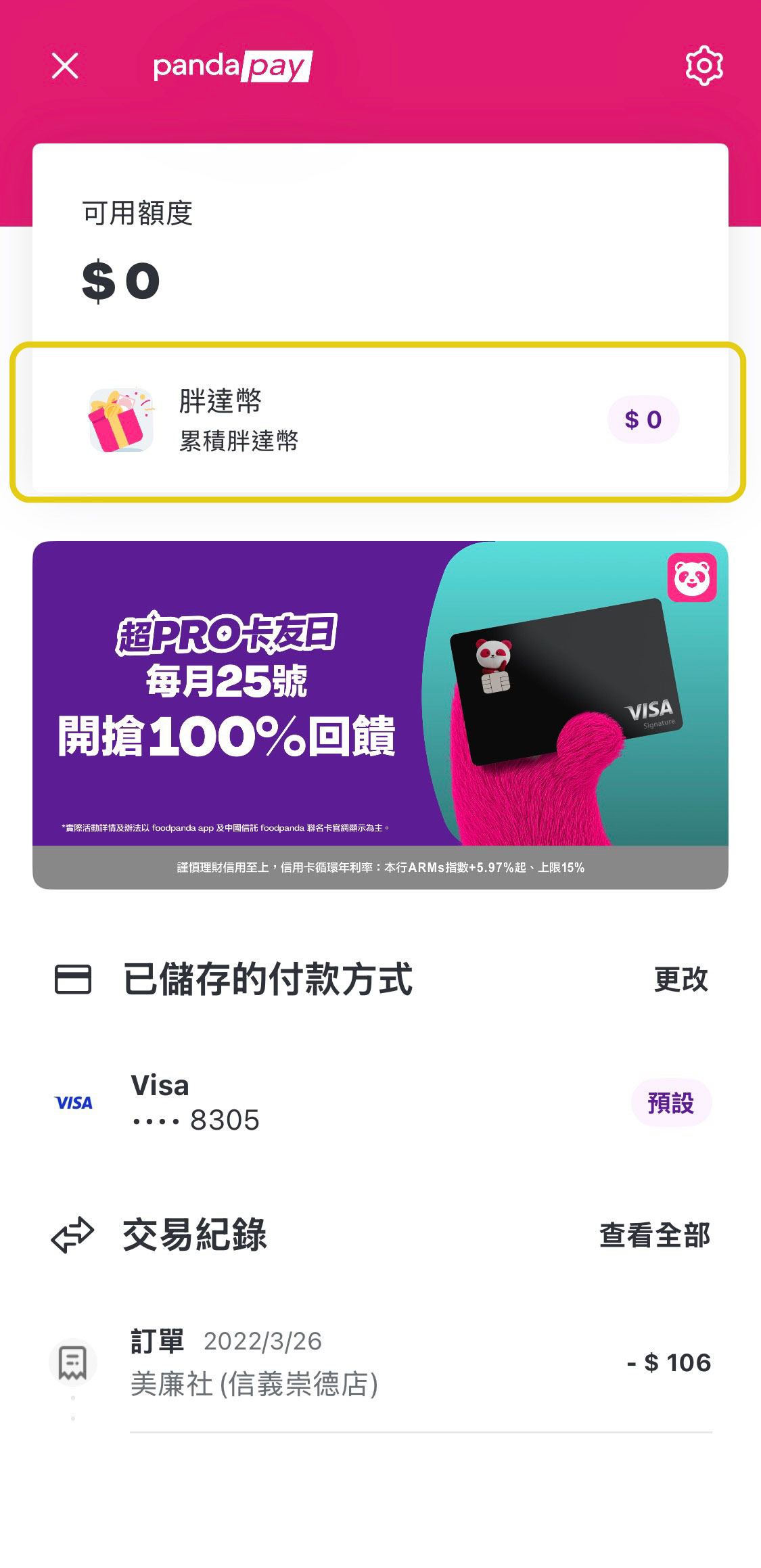 1. 使用 foodpanda 聯名卡刷滿額輸入指定優惠碼 pandapro 用戶享 100% 胖達幣回饋,回饋上限胖達幣 150 元。 2. 2026/04/01 ~ 2026/06/30 每月優惠碼文字不同,需自行至「foodpanda app 內 > 美食外送 > 100% 胖達幣回饋優惠碼」領取當月優惠碼,每人每月限領取一次。 3. 優惠碼限於美食外送或外帶自取指定店家並使用中國信託 foodpanda 聯名卡線上付款,且結帳時須輸入優惠碼方可享有回饋,部分店家不適用,優惠碼使用資格以 foodpanda app 及官網公告為準。 4. 優惠碼回饋之胖達幣將於訂單完成後 3 個工作天內存至 pandapay 帳戶且存入後之 3 日內需使用完畢,無折抵門檻,逾期將無法使用並不再補發。此優惠碼不可與站上其他現金回饋活動疊加。 5. 若一般用戶訂閱成為 pandapro,系統約需數分鐘作業時間進行身份轉換方可使用此優惠碼,請務必於轉換時間過後再行下單,並於下單時再次確認是否正確套用優惠碼。 6. 若有任何使用問題,請至 foodpanda app 點選右下角「選單」>「客服中心」與客服中心聯繫。 7. 優惠碼每日數量有限兌完為止。本優惠由 foodpanda 提供,本行僅代為轉知相關優惠訊息,所有優惠詳情如使用門檻、最高折抵金額、使用期限等以 foodpanda app 及 foodpanda 官網結帳頁面顯示為主,foodpanda 保留隨時單方修改權利。 |