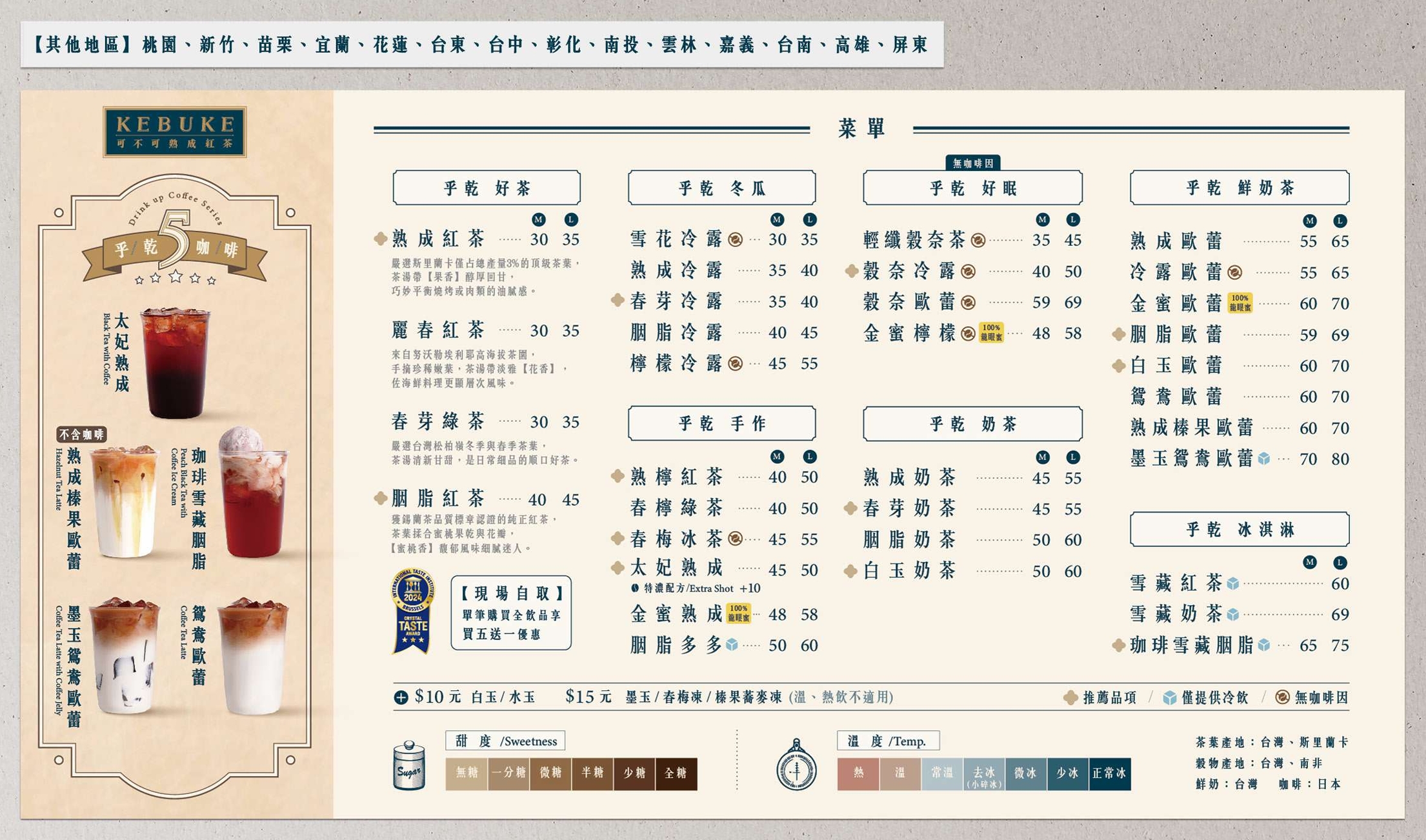 可不可熟成紅茶桃園、新竹、宜蘭、苗栗、台中、彰化、雲林、南投、台東、花蓮分店適用以下菜單。