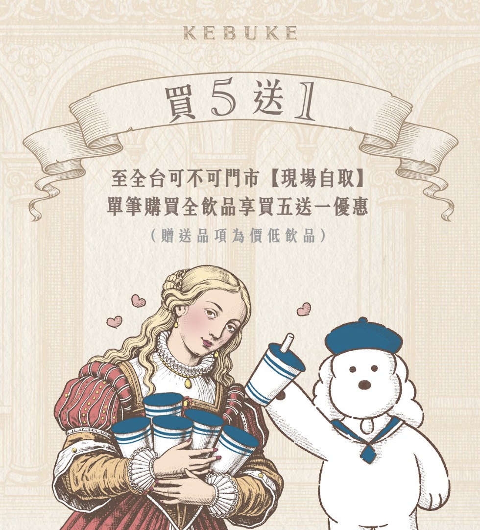 2026 年 1 月 1 日至 12 月 31 日,到可不可門市購買任一飲料,可享買五送一優惠,贈送品項為價低飲料。