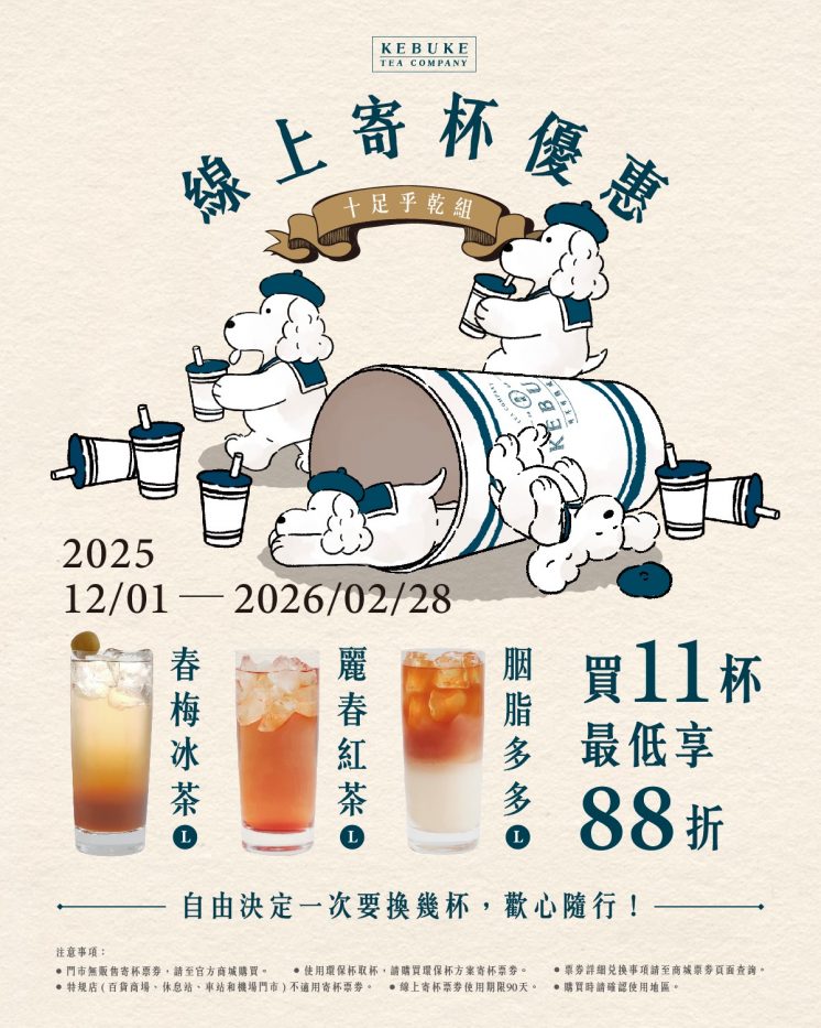 12/1~2026/2/28,使用線上寄杯服務買 11 杯,可享買十送一優惠,最低 88 折 ! 👉看優惠組