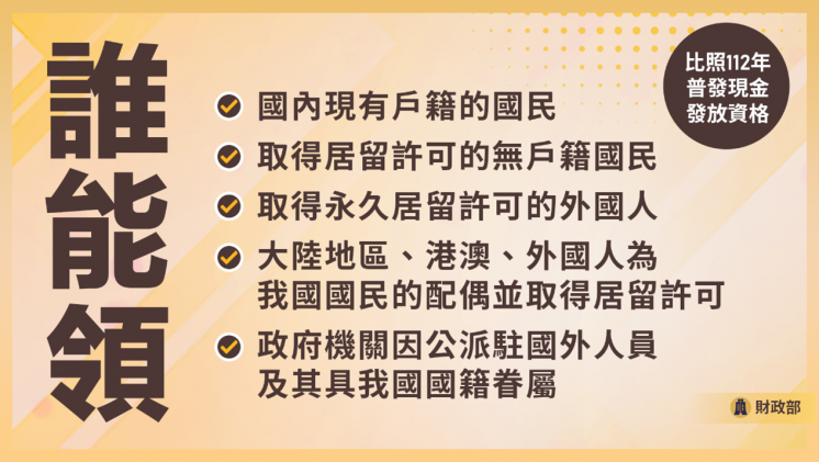 行政院於 2025 年 9 月 11 日宣布,1 萬元發放資格將比照 112 年的普發現金辦理,凡具中華民國戶籍的國民、已取得永久居留的外國人大陸及港澳配偶,為我國政府機關因公派駐國外之人員及具國籍之眷屬,都可以領取。