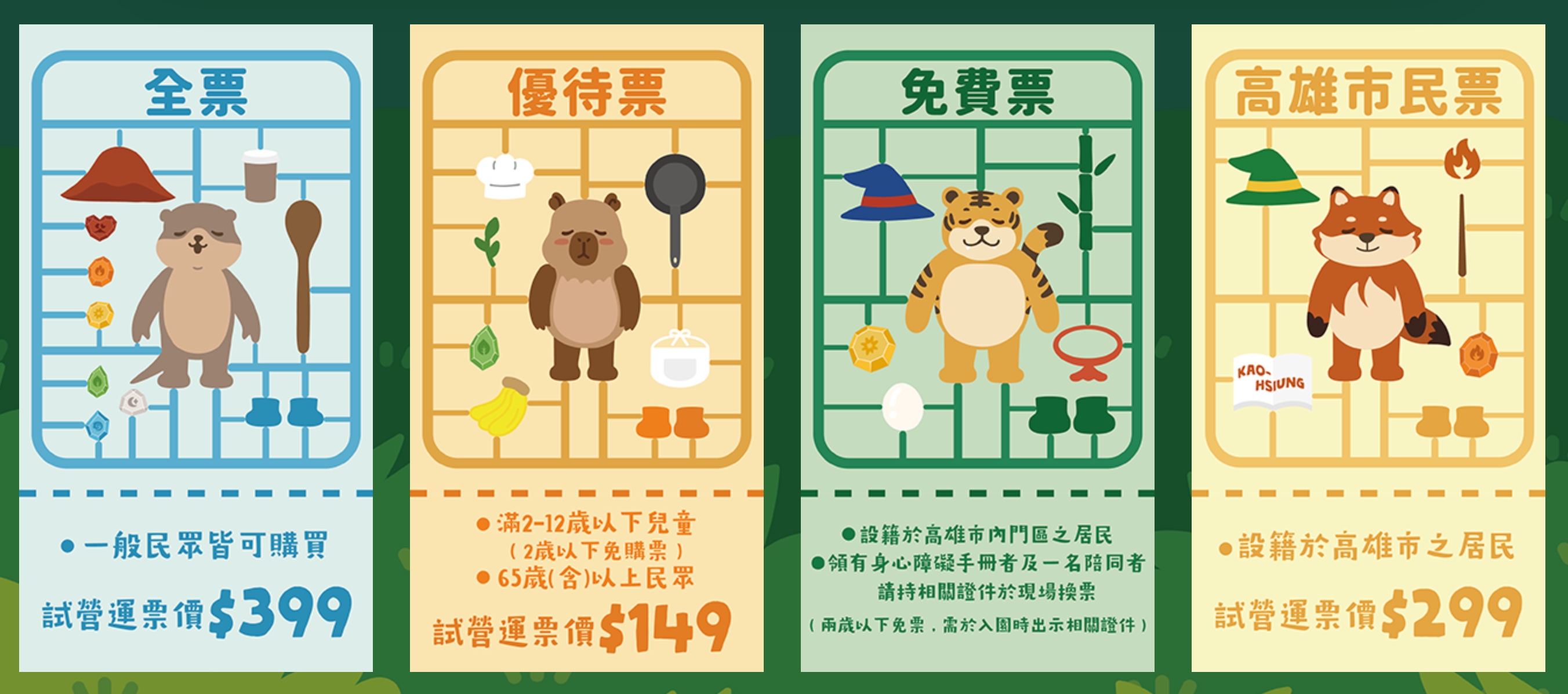 | 免費票 設籍高雄市內門區之居民 領有身心障礙手冊者+陪同者1人 *需持證件 | 0元 |